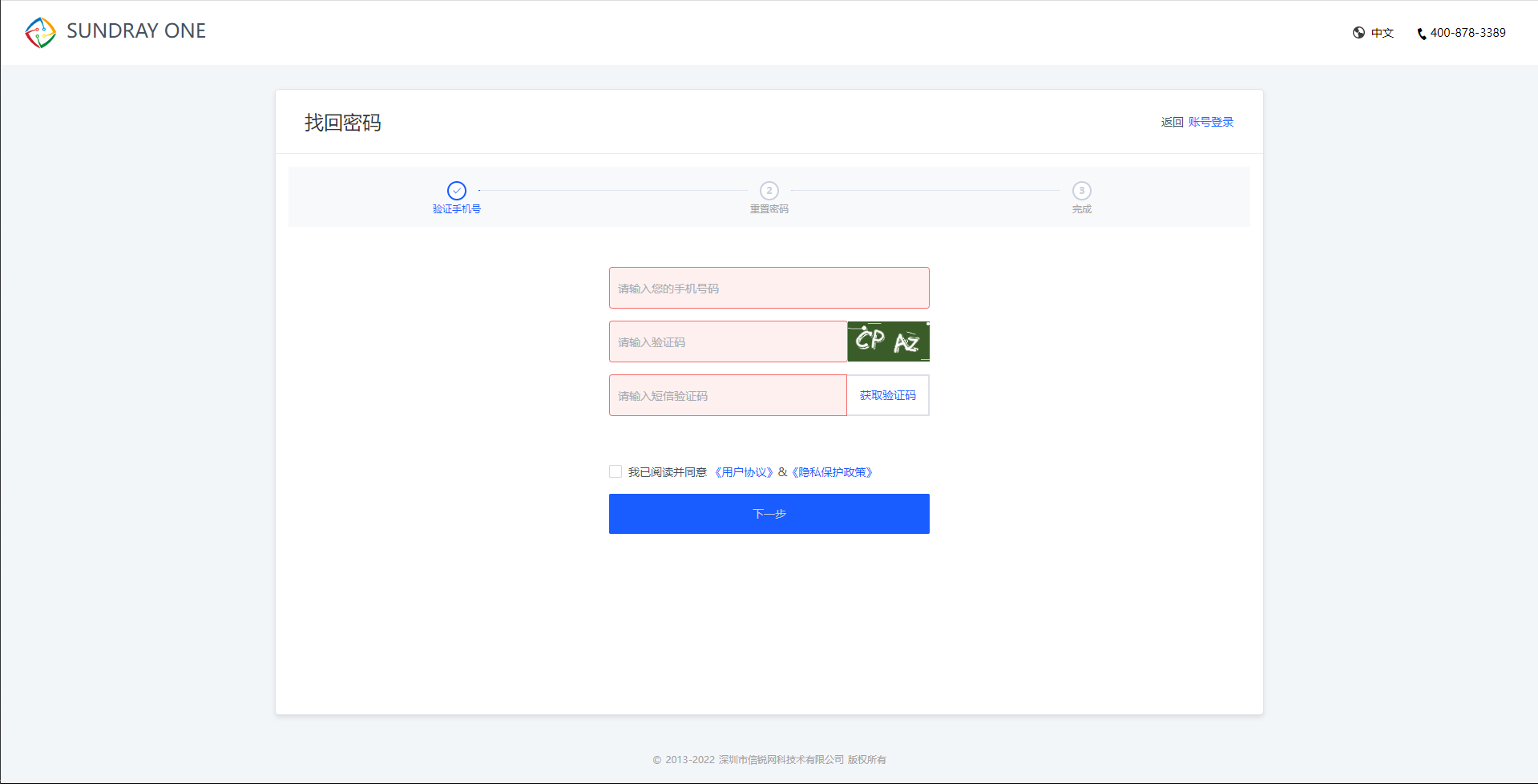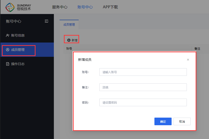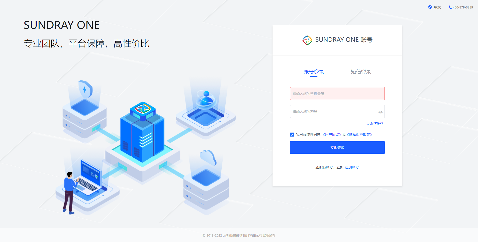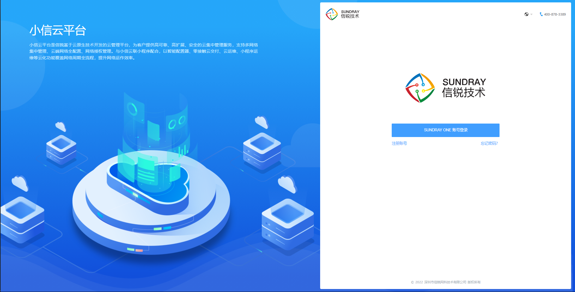 锐灵小信云平台访问地址链接为:https://cloud.sundray.com.cn,可以在该界面进行【账号注册】、【账号登录】、【重置密码】操作。