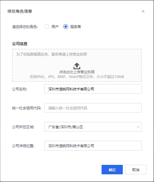 【服务商】角色必需要上传营业执照图片,填写统一社会信用代码;