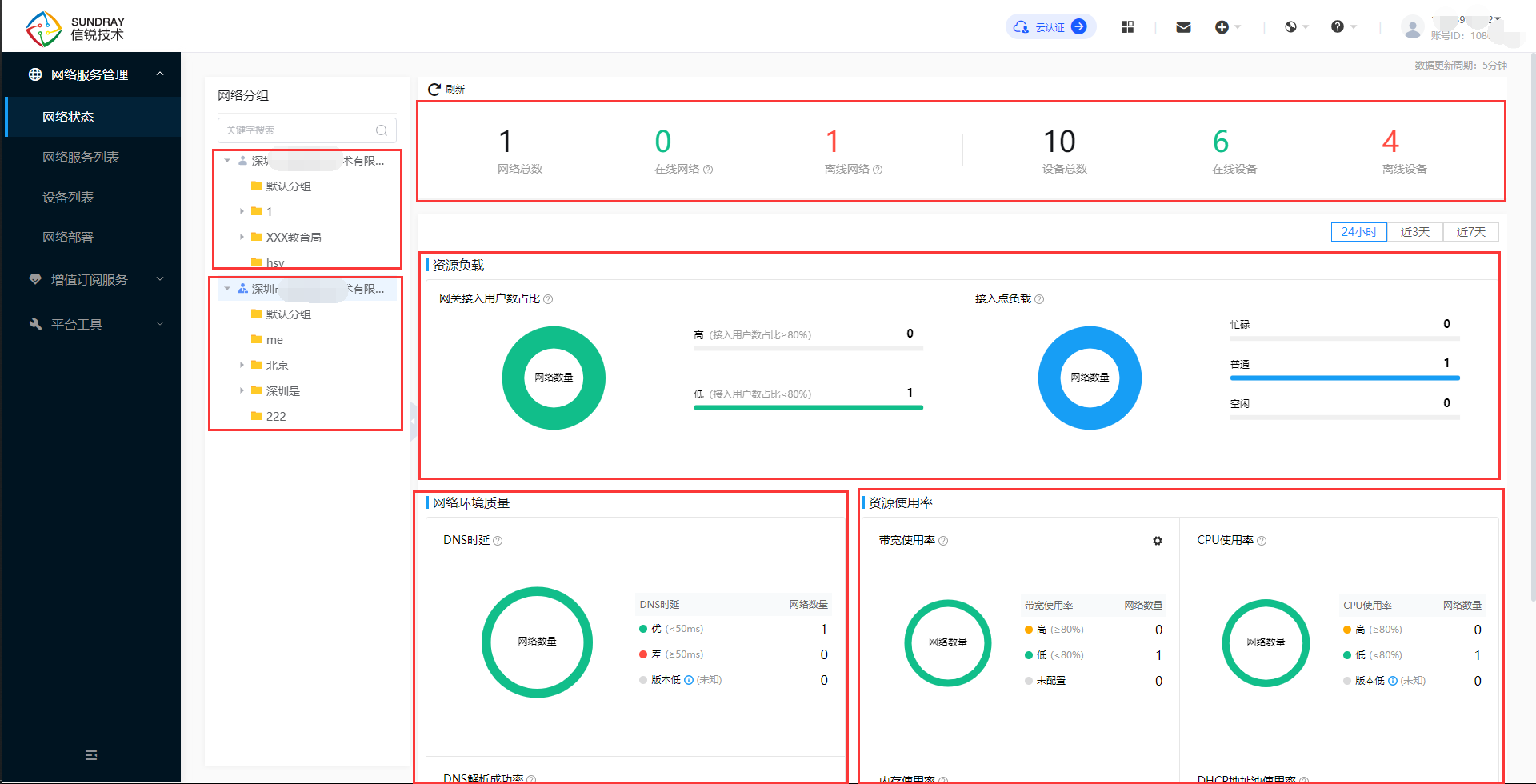 【网络状态】可以从账号视角、项目视角、设备视角三个维度对网络健康度进行统计和观察的功能,运维技术人员能够在不同的视角下了解到不同客户的网络运行状况,从而提升网络监控的便捷性,提升网络运维的及时性。