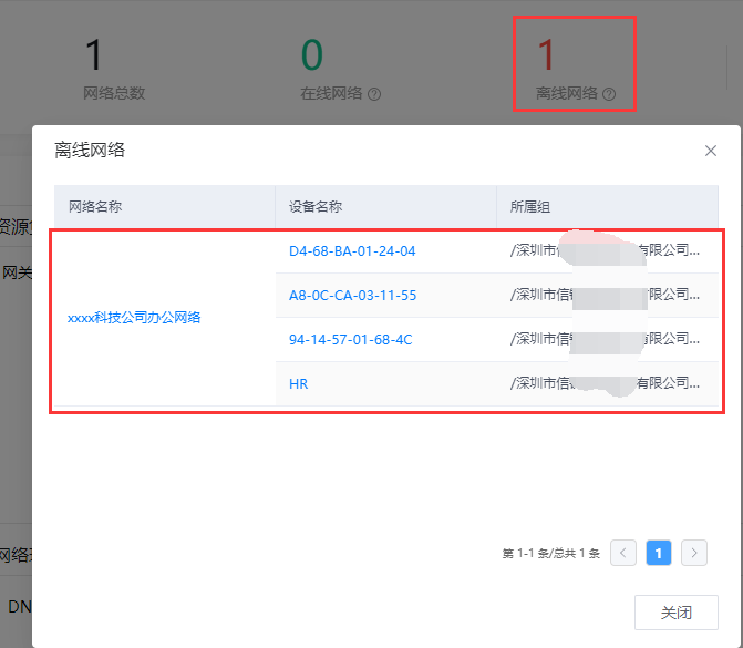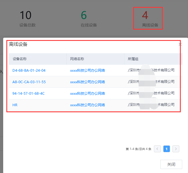 【离线设备】统计在当前网络分组的账号分组目录下的离线设备数量,点击可查看具体的离线设备,点击具体的设备名称和项目名称可跳转到对应的详情页;