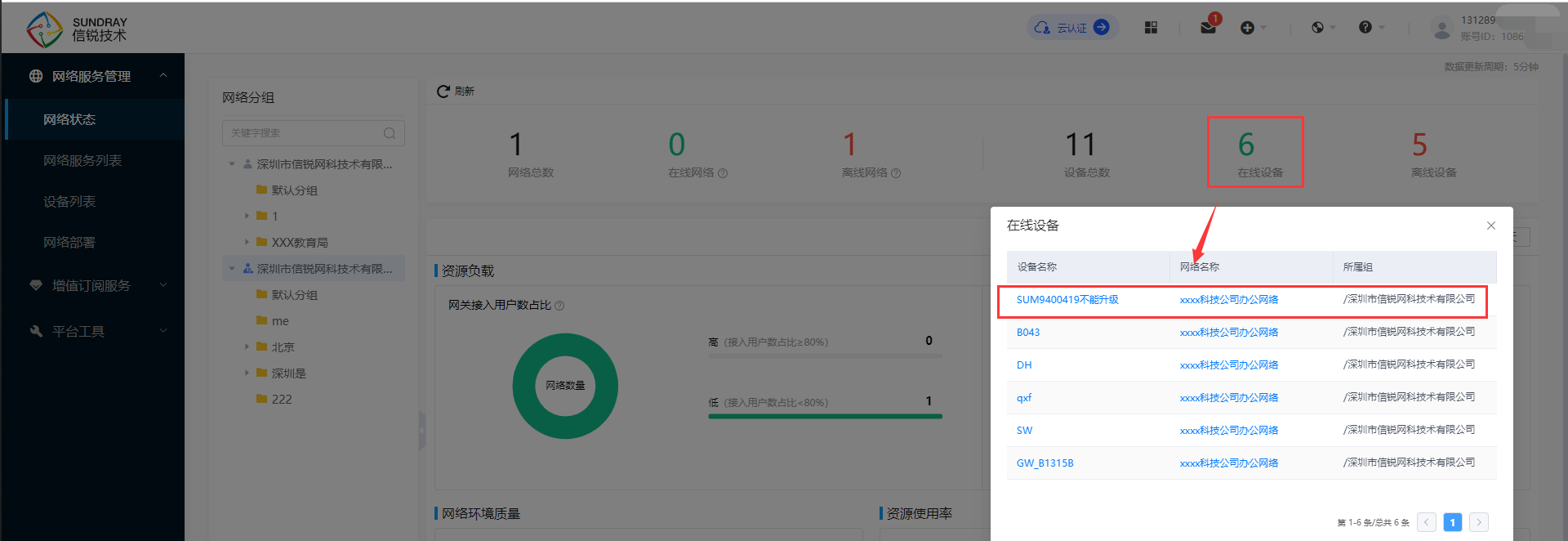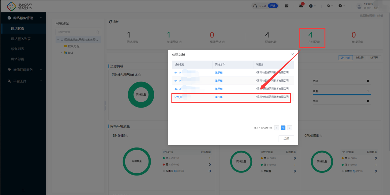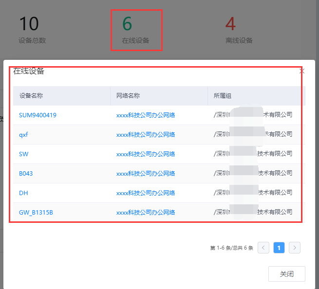 【在线设备】统计在当前网络分组的账号分组目录下的在线设备数量,点击可查看具体的在线设备,点击具体的设备名称和项目名称可跳转到对应的详情页;