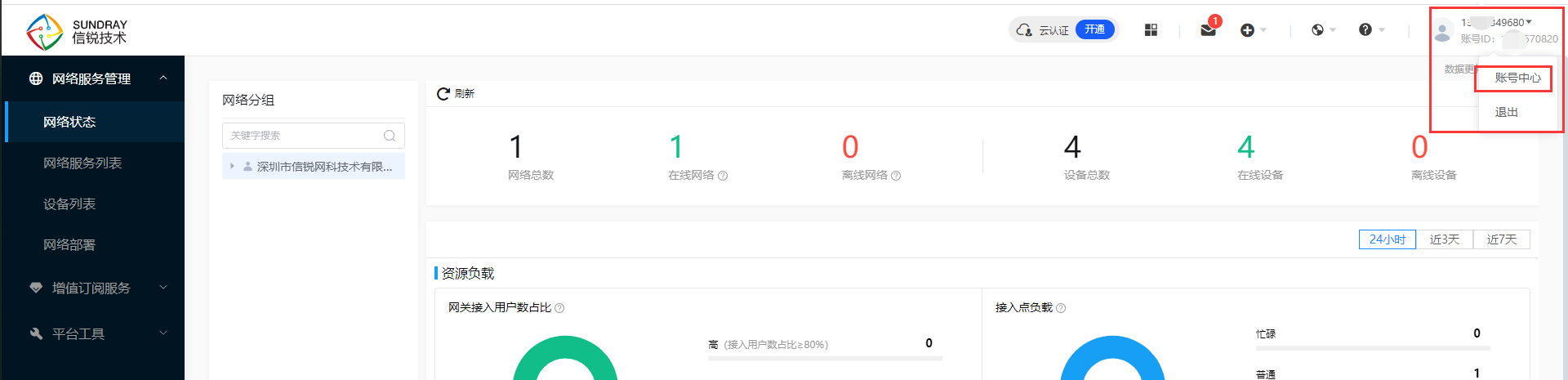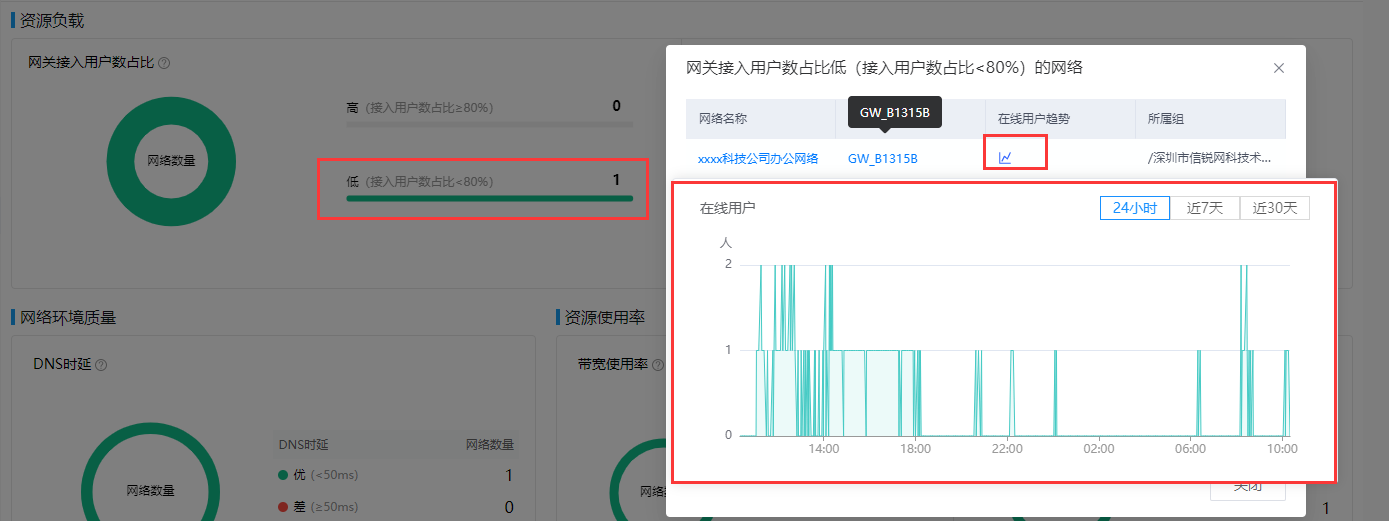 点击【网络服务列表】里的网络项目名称,可以跳转到对应网络项目的详情界面,包含【网络项目操作】、【网关/交换机/接入点/在线用户列表】、【网络环境质量】、【网络资源负载】模块