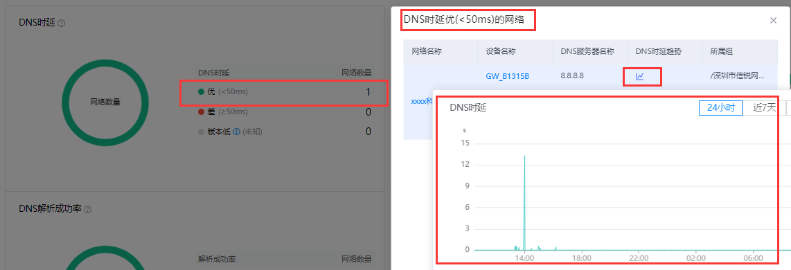 (3)图表详情呈现:项目名称、所属组、设备名称、DNS服务器名称(IP地址)、趋势图
