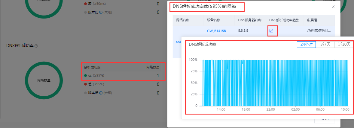 (1)统计方式:取项目下网关DNS在确定时间范围内解析成功率的趋势图(最近24小时(取上报的原始数据,一分钟一个点)、最近3天(聚合数据,一个小时一个点,需要在聚合的时间内上报的所有数据点位都是连通的,聚合的点才是连通)、最近7天(也是一个小时一个点))