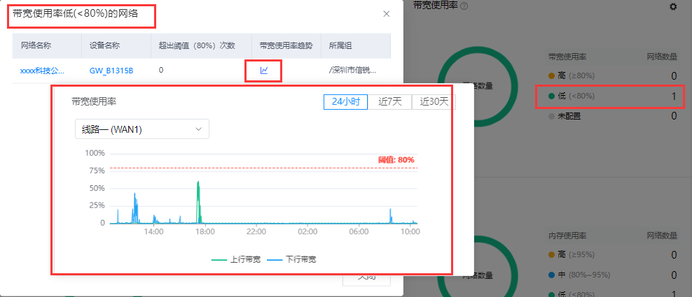 (1)统计方式:取项目下网关的带宽利用率在时间范围内(24小时、最近3天、最近7天)的最大值,>=80% 高 <80%低