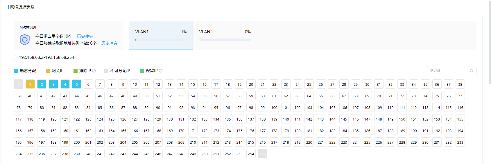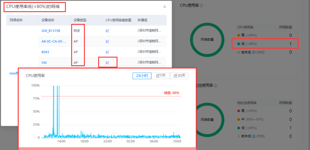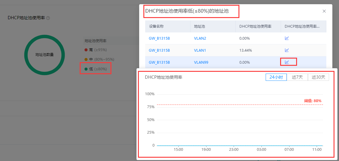 (1)统计方式:取项目下网关的DHCP地址池利用率在时间范围内(24小时、最近3天、最近7天)的最大值,区间: 低(<=79%) 中(80-94%) 高(>=95%)