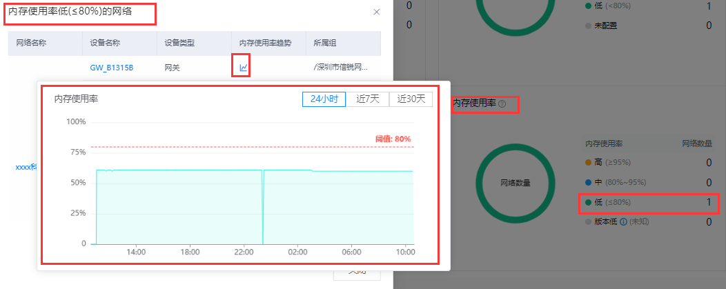 (1)统计方式:取项目下网关的内存使用率在时间范围内(24小时、最近3天、最近7天)的最大值,>=80% 高 <80%低