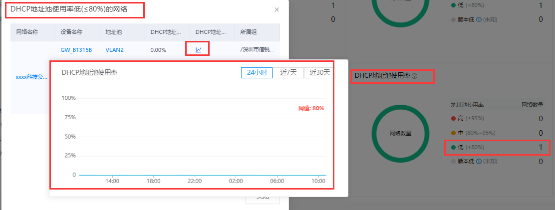 (3)图表详情呈现:项目名称、所属组、设备名称、vlan、DHCP地址池利用率、趋势图