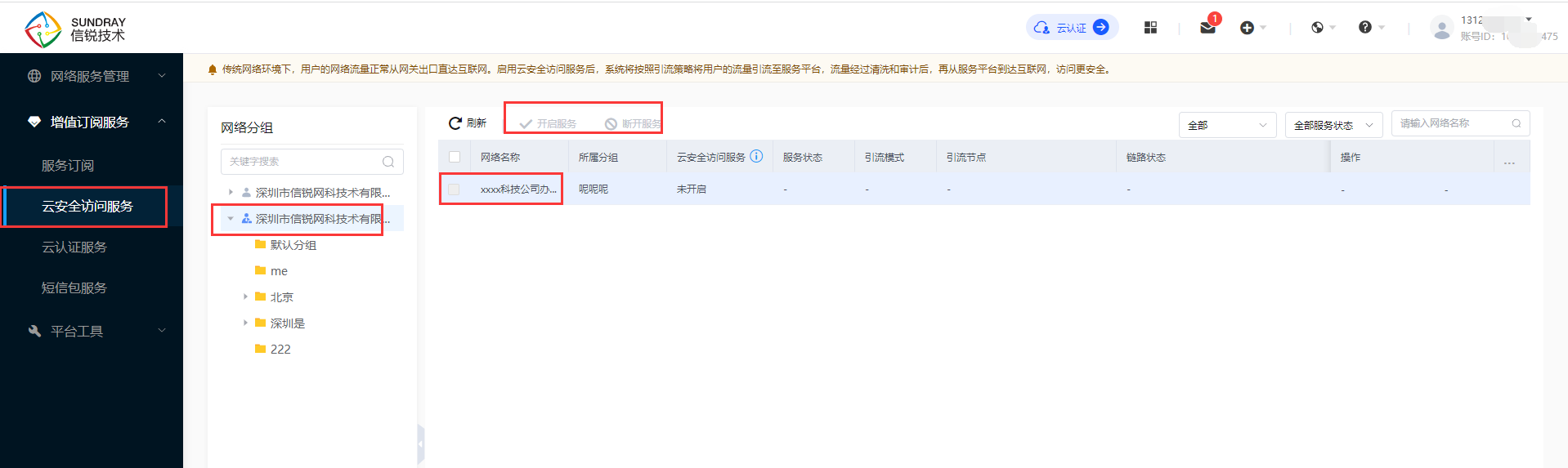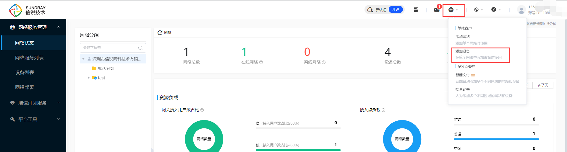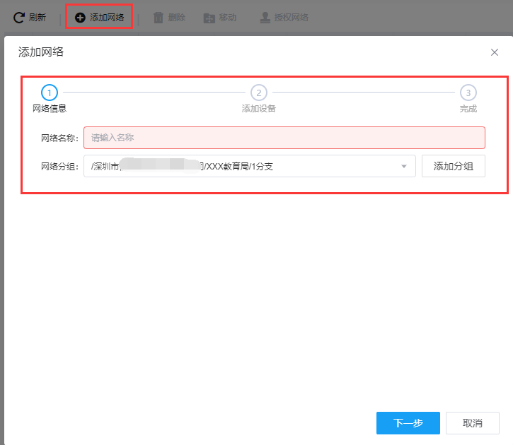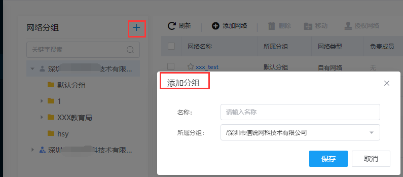【添加分组】根据客户多分支网络结构,在对应的账号下面添加网络分组
