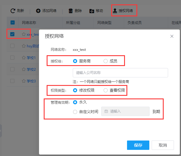 【授权网络】可以将网络项目授权给【服务商】、【成员】,可以设置授权的权限是【修改权限】或【查看权限】,同时也可以设置授权的有效期。