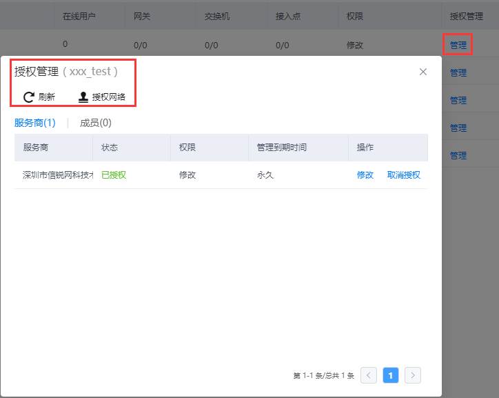 【管理授权】点击网络项目的【管理】按钮,可以看到该项目的授权情况,在此界面也可以进行网络项目授权、取消授权、修改之前授权的权限和有效期。
