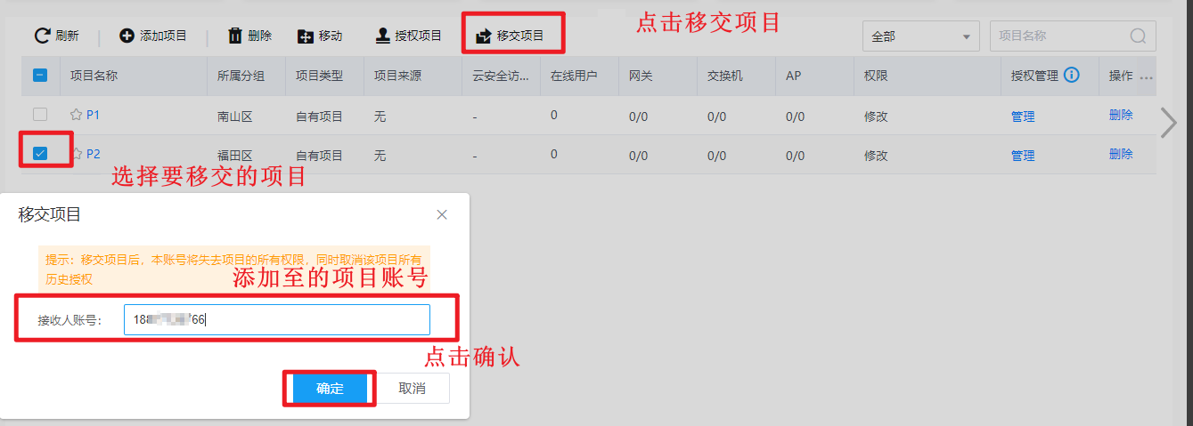提供网络项目的权限化管理,便于总部网络管理员对分支网络管理员进行权限管控,让网络管理更安全。根据项目管理的需要可对项目进行授权、移交操作,将项目的权限赋予给其他用户管理项目。