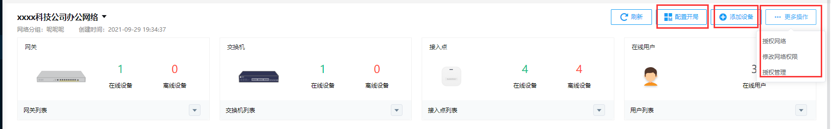 【网络项目操作】支持给网关设备配置开局功能、添加网关/交换机设备到对应的网络项目、点击 更多操作 按钮支持网络项目的授权、修改网络权限、历史授权管理