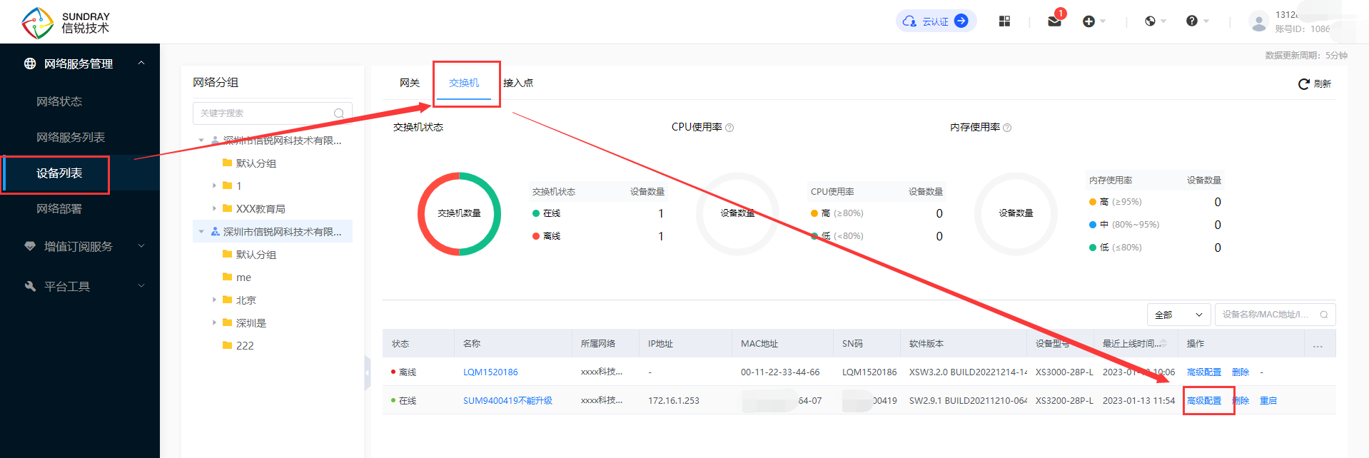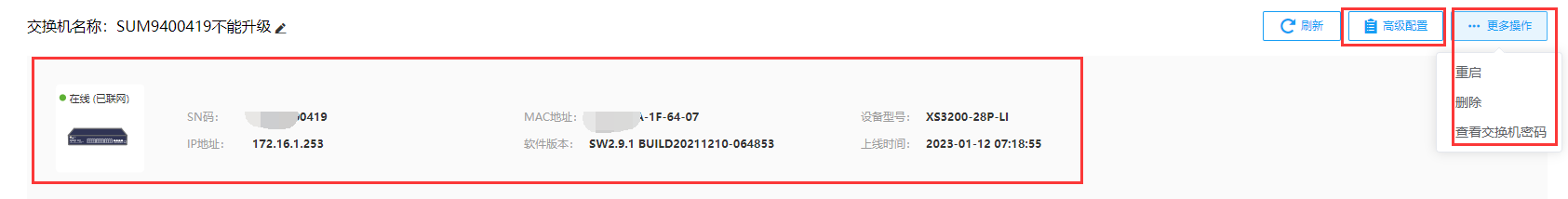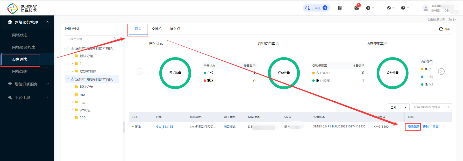 在设备列表里面,找到对应的XMG网关或者XS云管交换机设备,点击高级配置,可以跳转到对应设备的功能配置界面,详细的功能配置参考对应型号设备的用户手册。