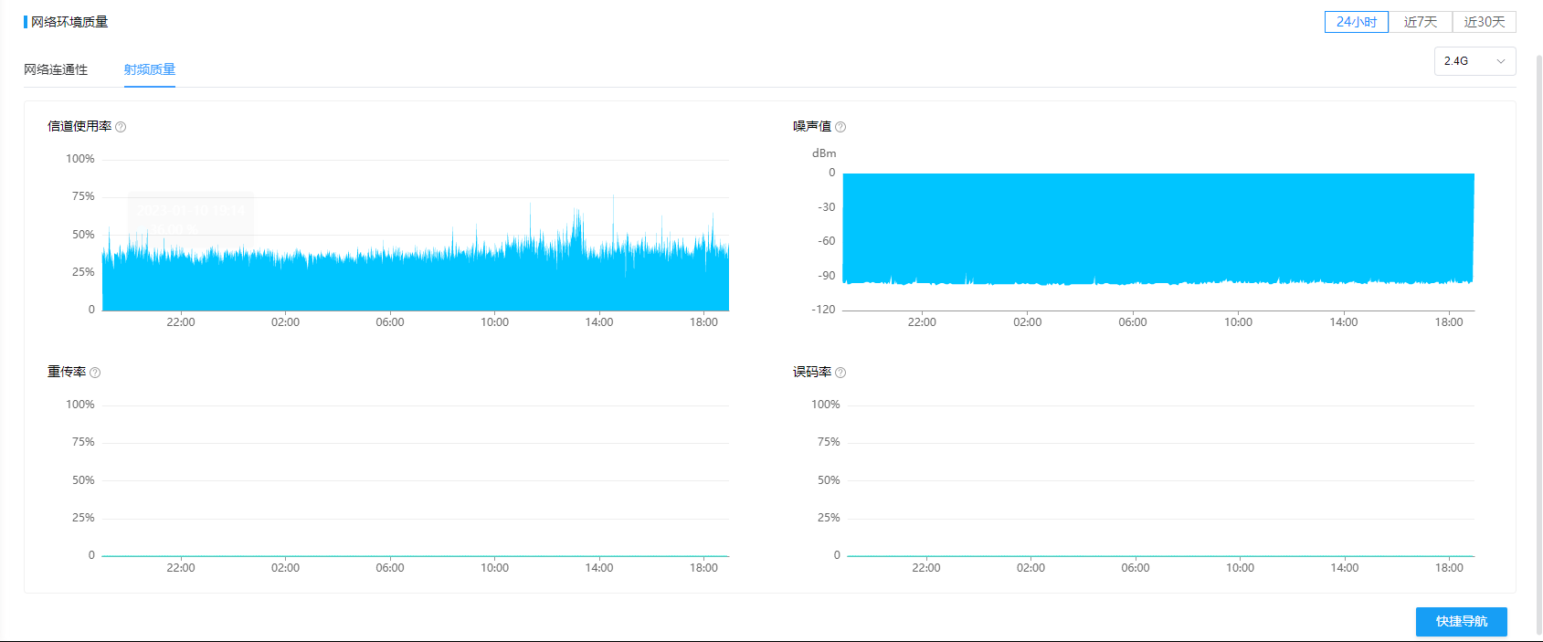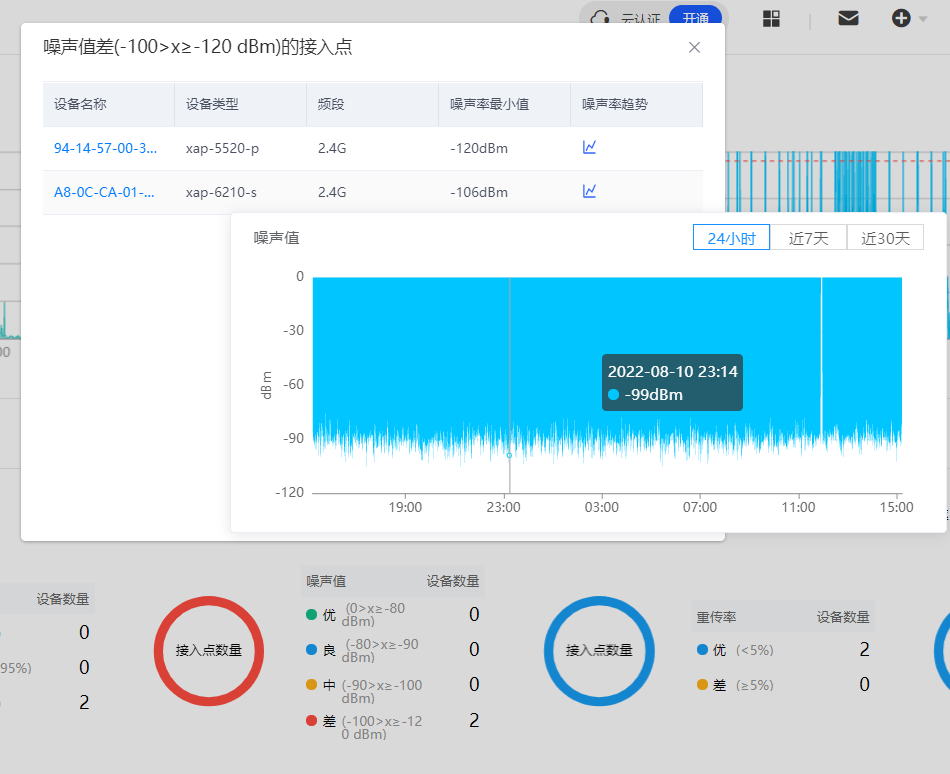 (1)统计方式:取项目内所有AP在时间范围内(24小时、最近3天、最近7天)的最小值。区间:0~-80dBm(优)、-80~-90dBm(良)、-90~-100dBm