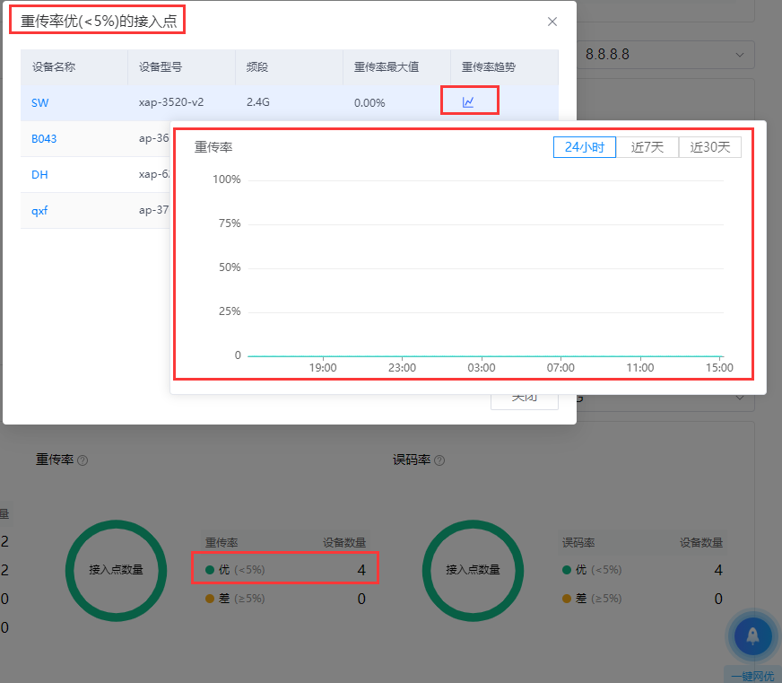 (3)图表详情呈现:设备名称、设备型号、重传率、趋势
