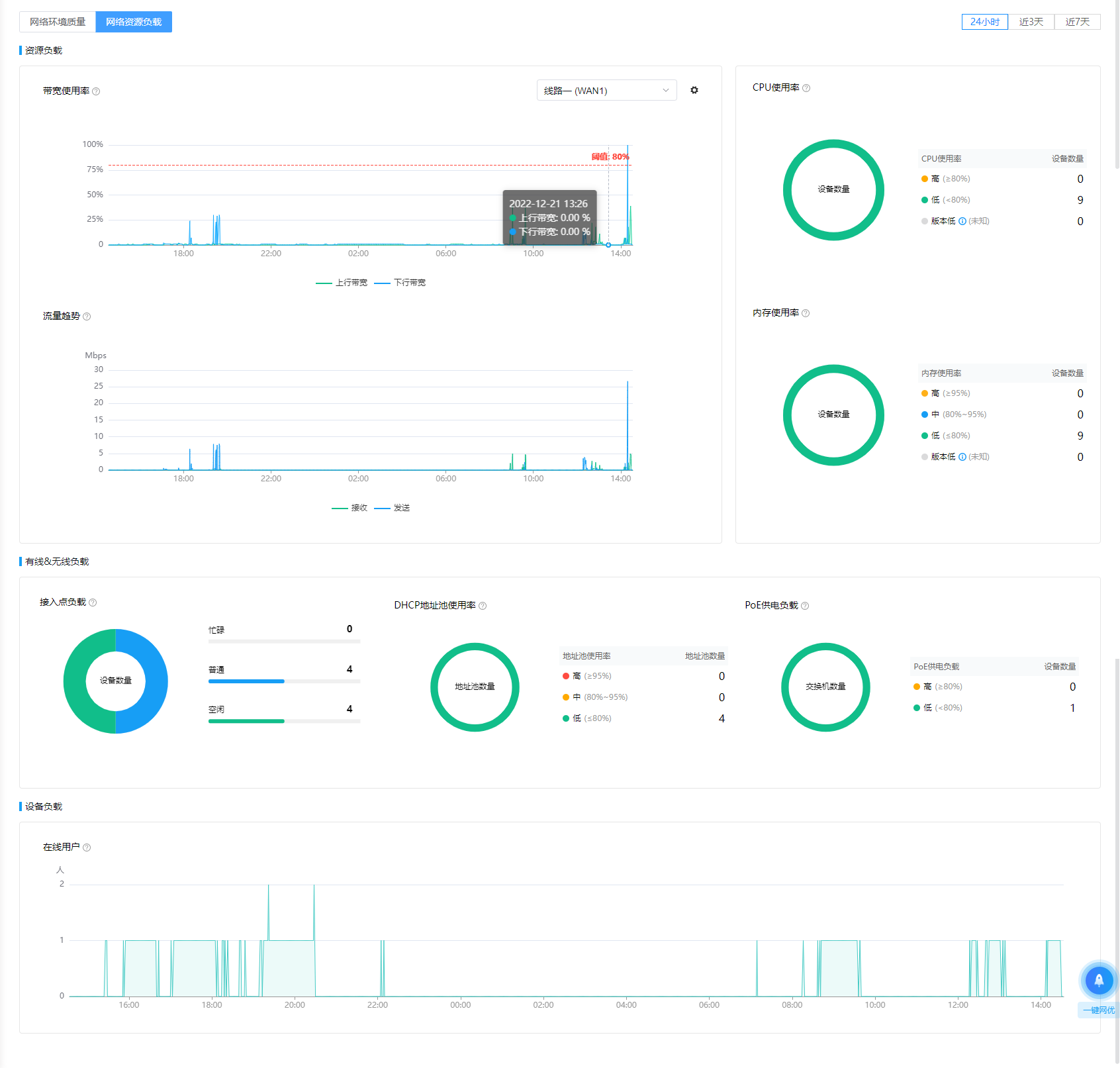 (1)统计方式:取项目下网关的接入用户数在时间范围内(24小时、最近3天、最近7天)的最大值,高>=80% 低<80%