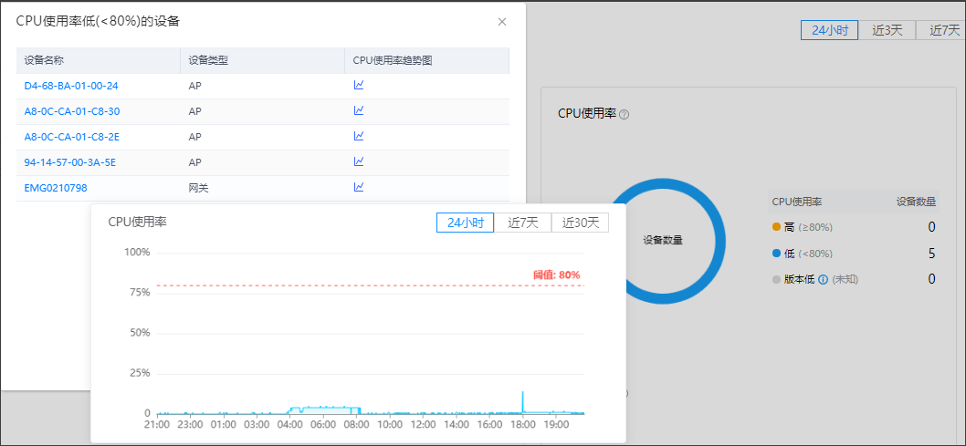 备注: 当项目下的网关低于3.0.5版本时,如果网关有连接AP,那么该网关会被划分到高版本,AP记为低版本,如果项目下只有网关没有AP,那么网关记为高版本设备,参与CPU统计