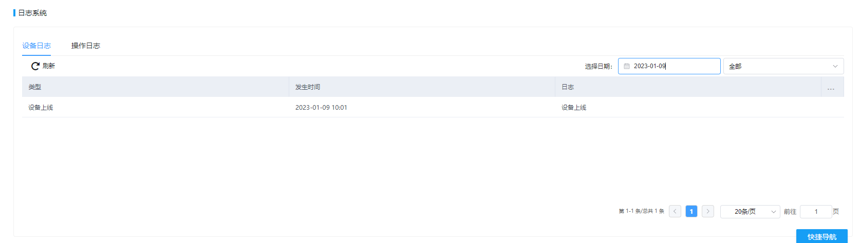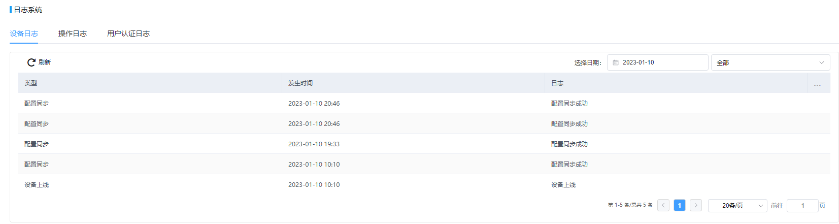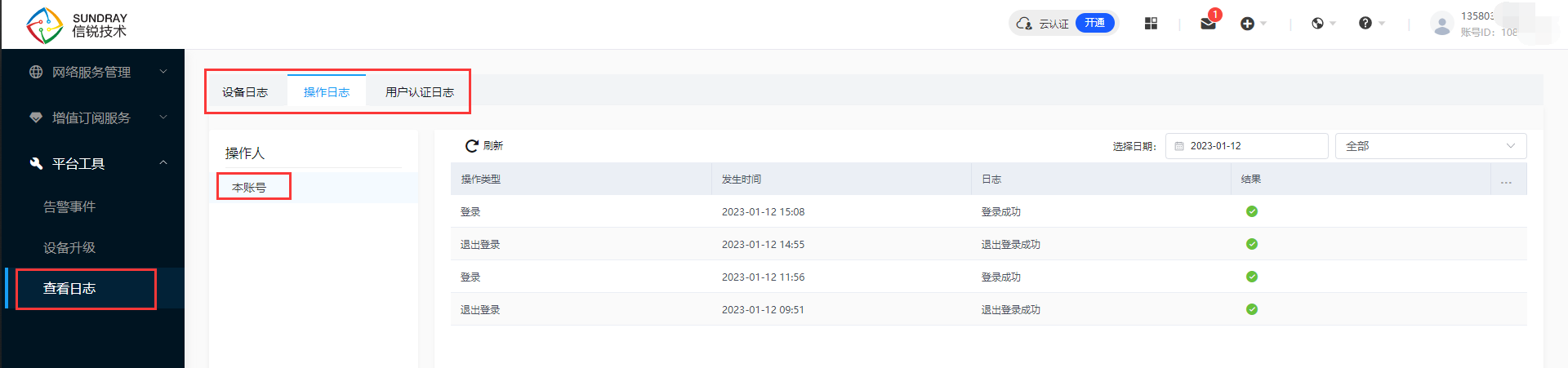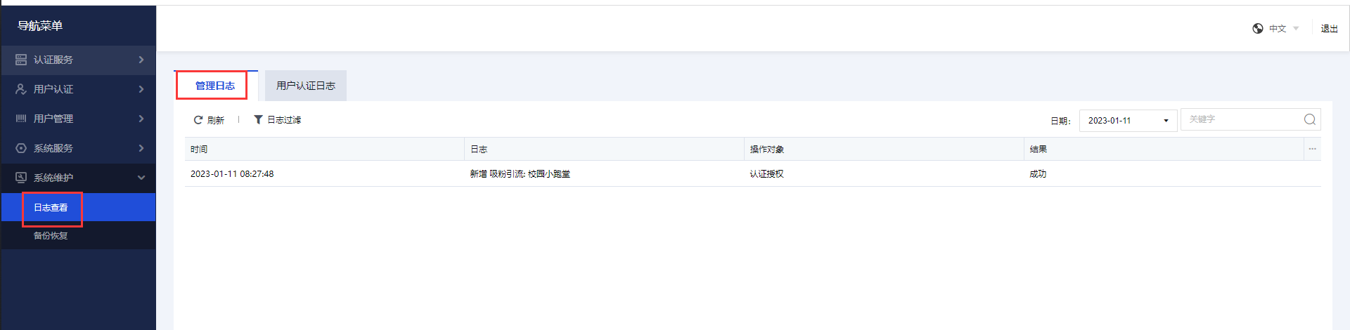 管理日志:管理日志中,记录了管理员登录、注销、修改配置的历史日志。