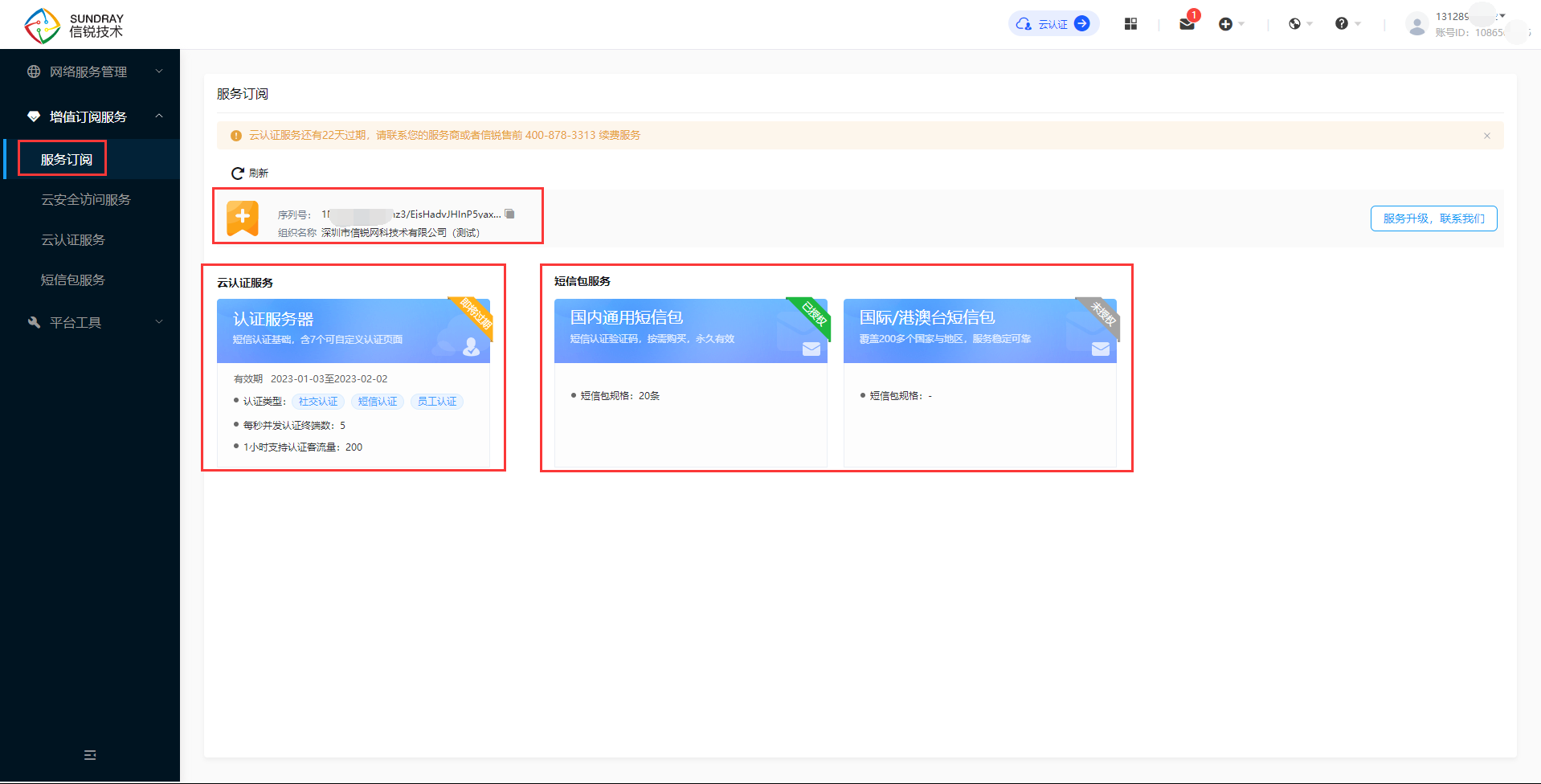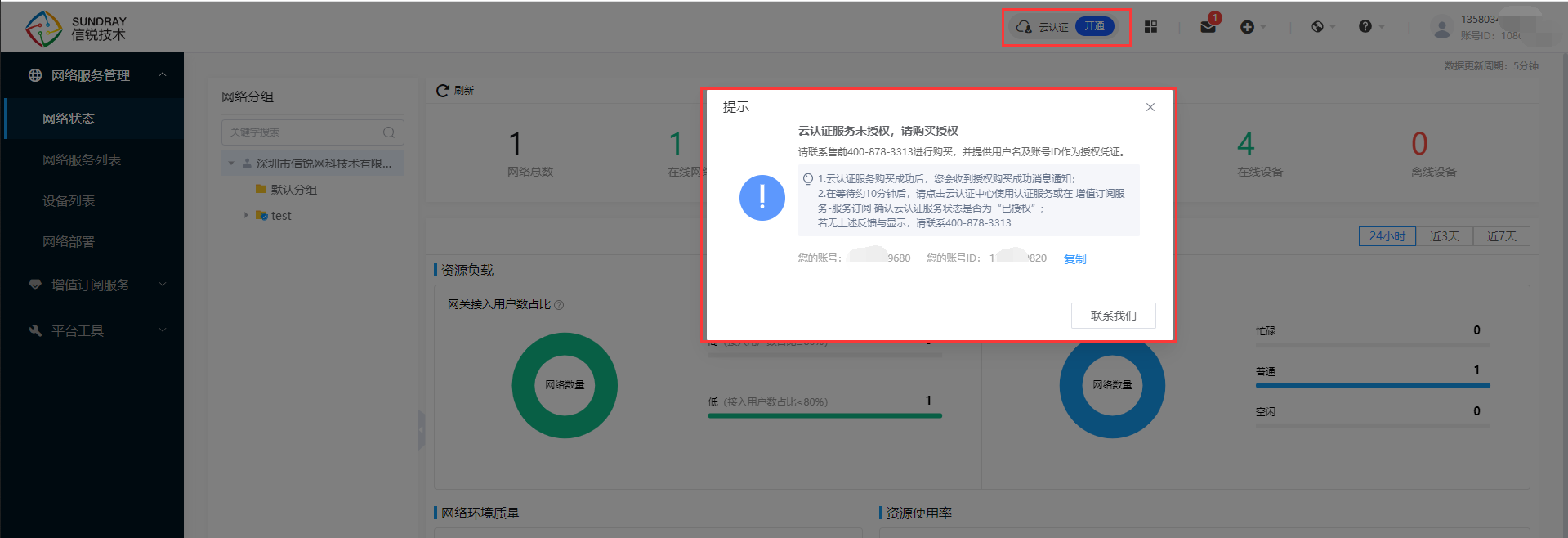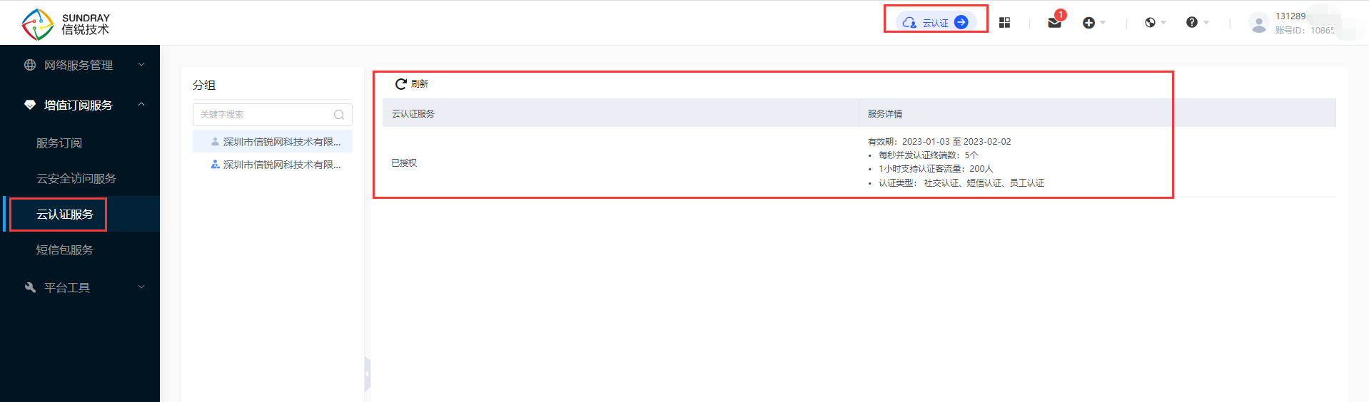 需要先在小信云平台界面开通云认证授权服务(联系当地办事处销售),才能跳转到锐灵小信云-云认证中心的配置界面。