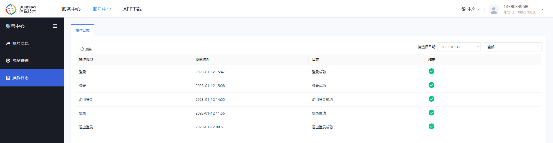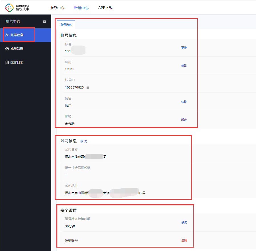 支持更换当前账号绑定的手机号、修改当前账号的密码、查看账号ID、修改账号的角色、绑定账号邮箱(海外告警推送)、修改当前账号的公司信息、修改当前账号的登录状态持续时间、注销账号功能。