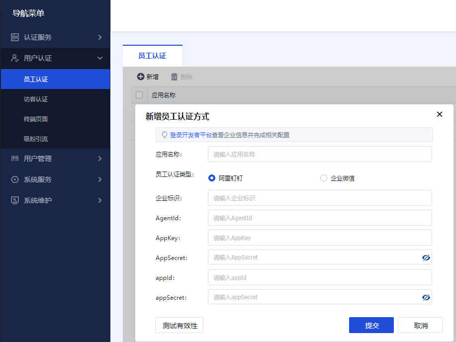 支持配置员工认证类型包括:对接阿里钉钉、对接企业微信,详细配置参考对应功能配置手册
