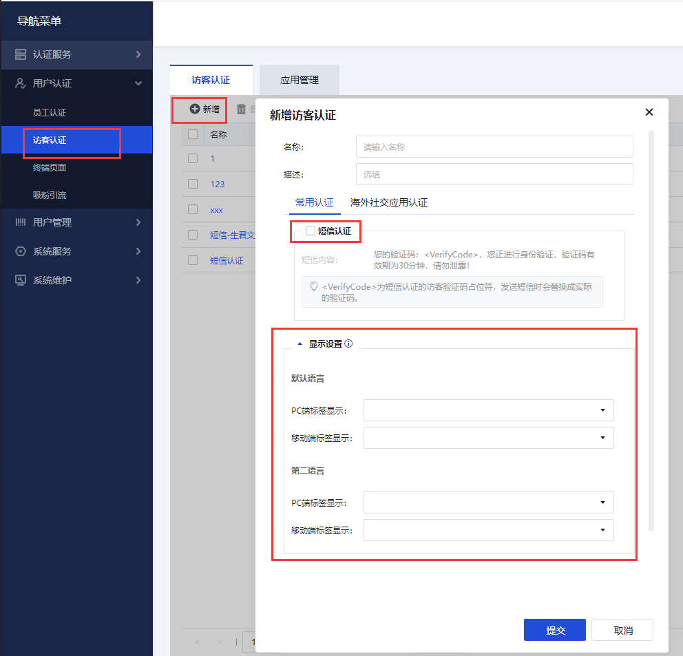 支持配置访客认证类型包括:短信认证(需开通短信认证授权)、海外社交认证(仅支持海外),详细配置参考对应功能配置手册