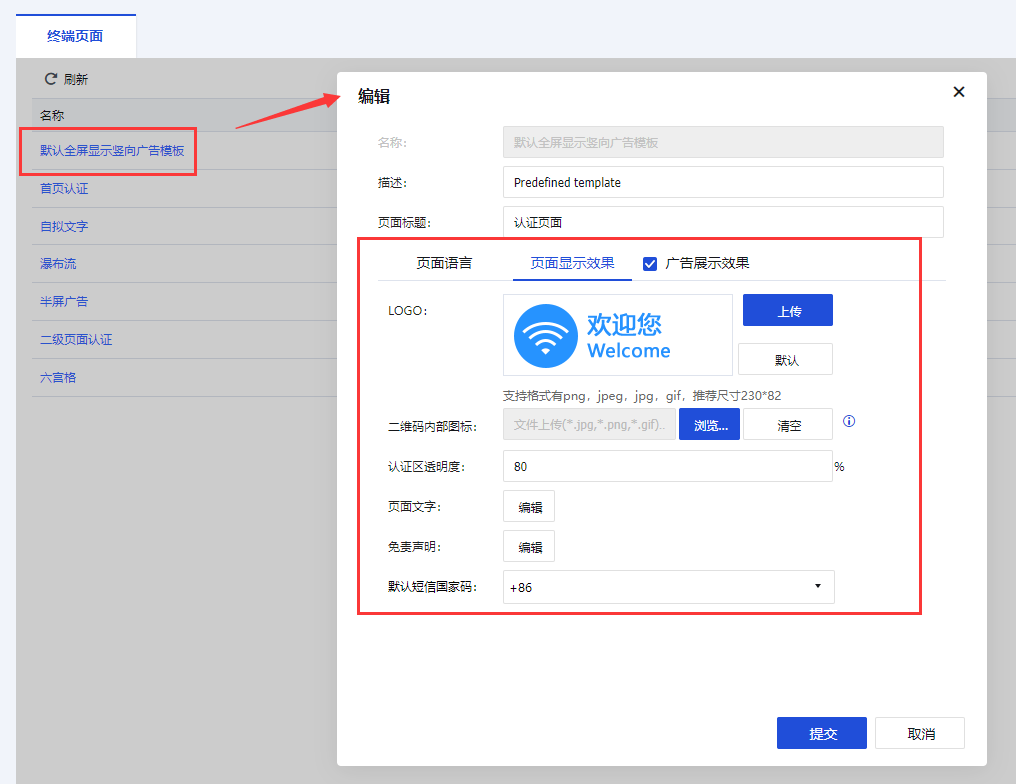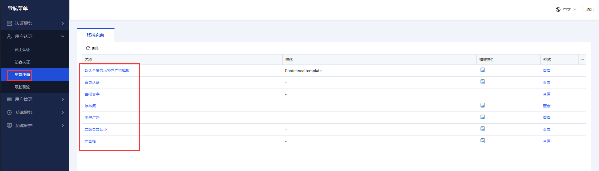 系统提供7种不同类型的终端认证页面,可以自定义修改认证页面的相关图片和界面文字内容。