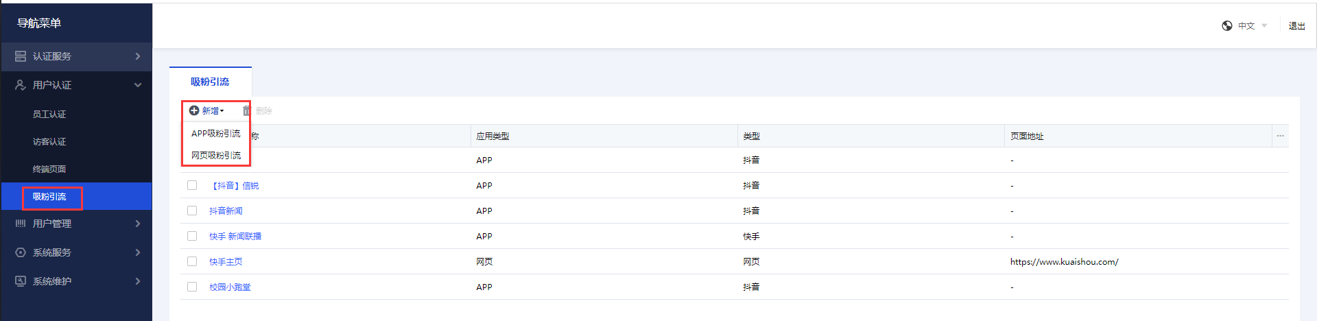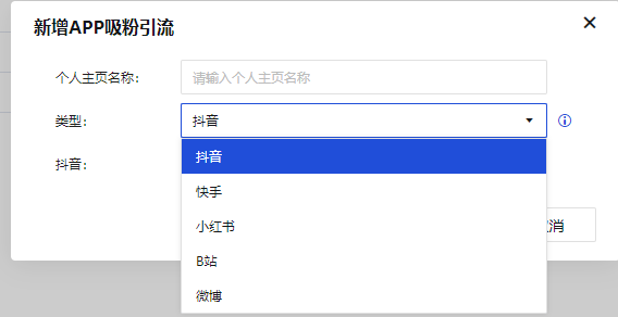 支持配置APP吸粉引流(抖音、快手、小红书、B站、微博)、网页吸粉引流(认证后跳转URL)