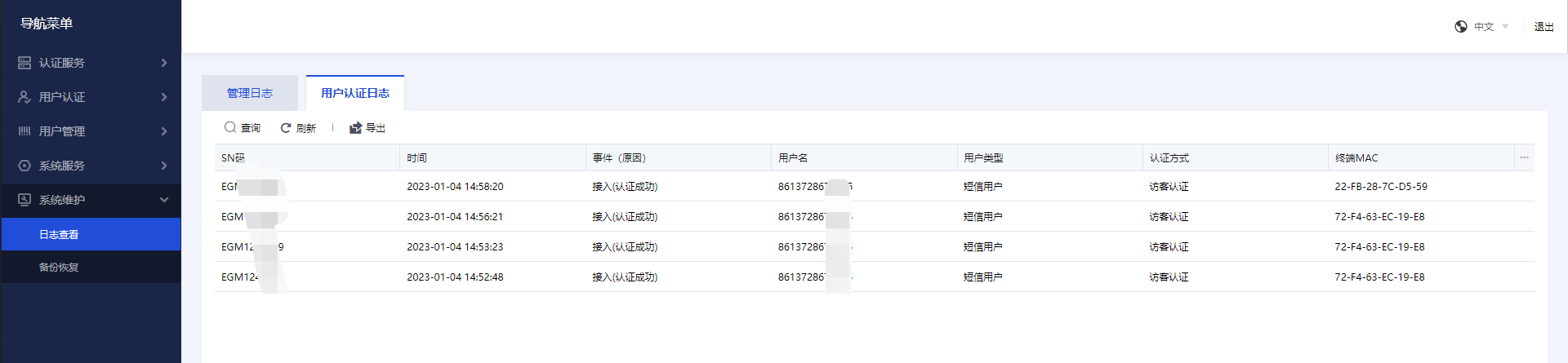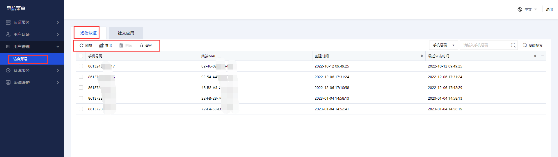 支持查看、导出、删除、清空当前小信云账号下所有网络项目设备的短信认证的访客账号记录,支持查看、导出、删除、清空当前小信云账号下所有网络项目设备的社交认证(仅支持海外)的访客账号记录。