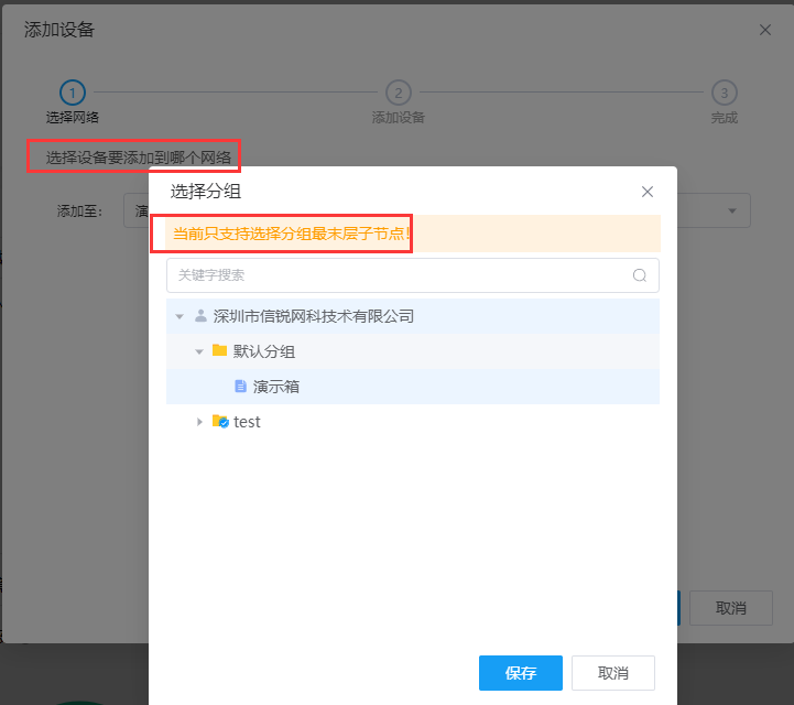 选择对应的网络项目分组(只支持分组最末层子节点),输入SN和MAC地址添加设备到对应的项目(支持Excel批量导入)
