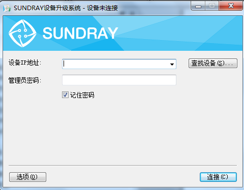 输入SUNDRAY设备的IP地址以及管理员密码后,点击连接即可连接到设备进行系统升级、恢复默认配置等操作,界面如下: