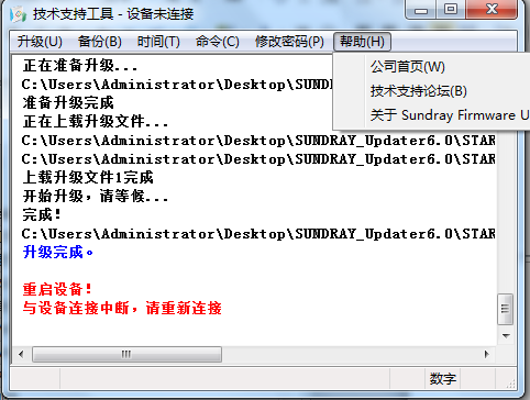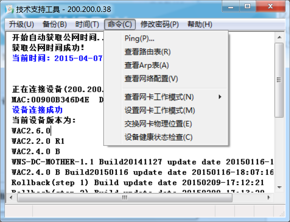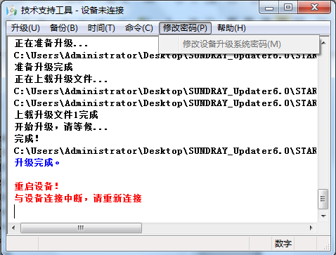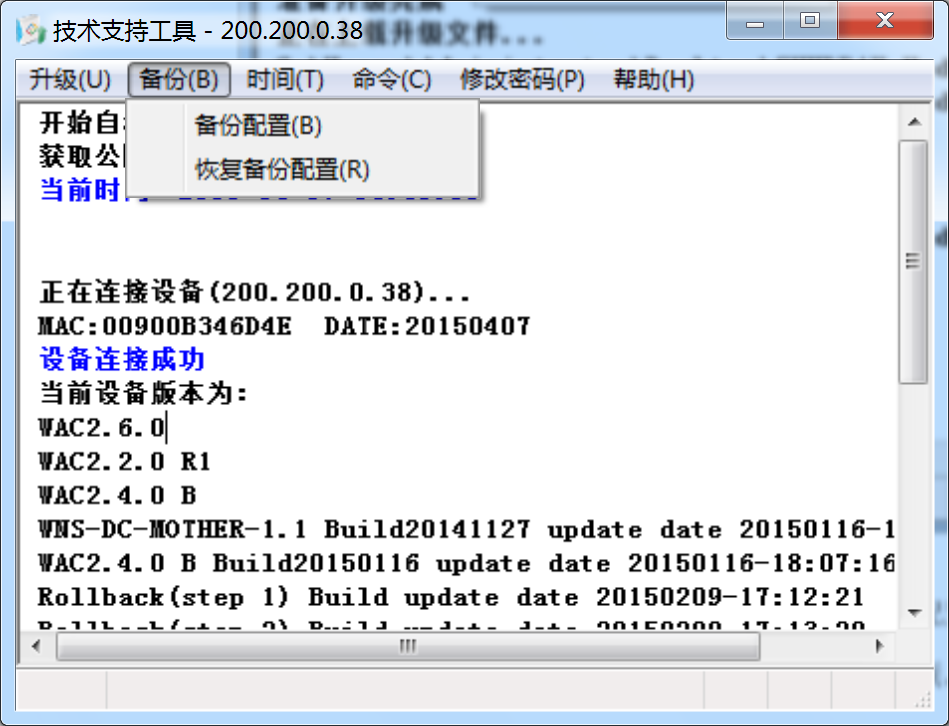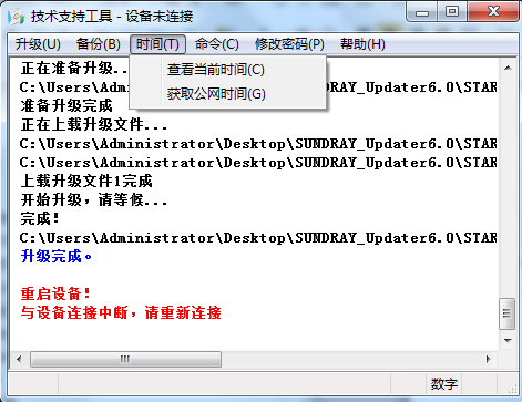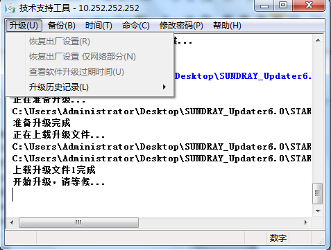 SUNDRAY设备升级系统连接到SUNDRAY设备后,可以按F10或Ctrl+Shift+F10启动技术支持工具。技术支持工具有『升级』、『备份』、『时间』、『命令』、『修改密码』和『帮助』几个菜单,下面分别介绍它们的功能。