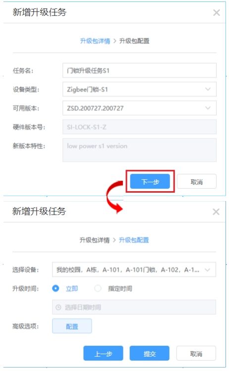 3)填写任务名称,设备类型选择[Zigbee 门锁-S1],可用版本可在下拉框中选择(此处 的版本是上传的固件包所解析的版本号),然后点击【下一步】,选择需要升级的设备(选 择 的设备为真实设备,即【终端接入】中的设备名称),点击【提交】,如图所示。