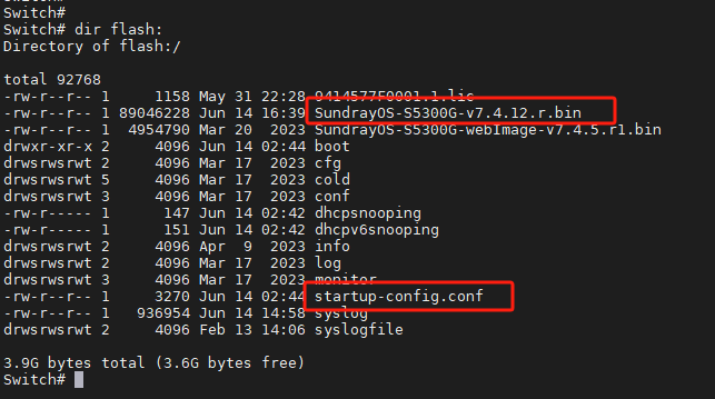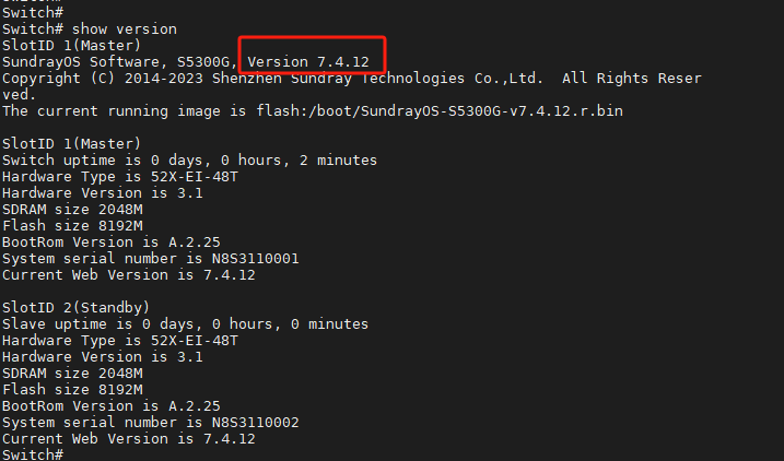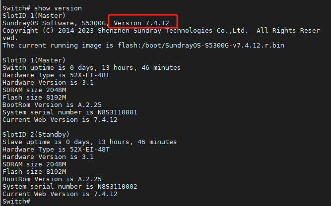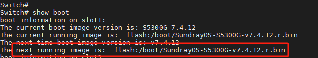 Swich# boot system flash:/boot/SundrayOS-S5300G-v7.4.12.r.bin //指定下次启动的镜像文件