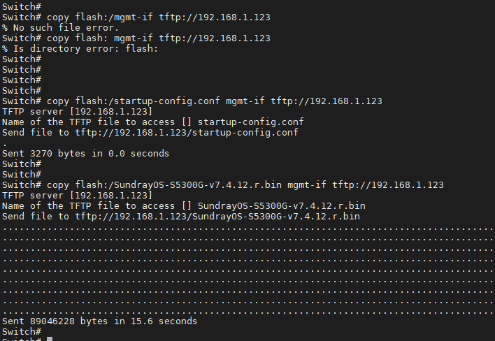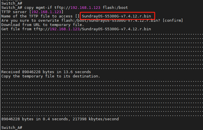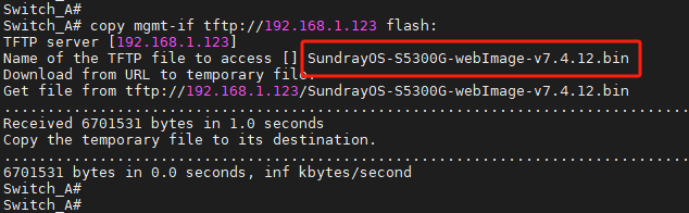 再复制一遍TFTP服务器目录下的镜像名称,如:SundrayOS-S5300G-v7.4.12.r.bin ,回车,即可完成上传