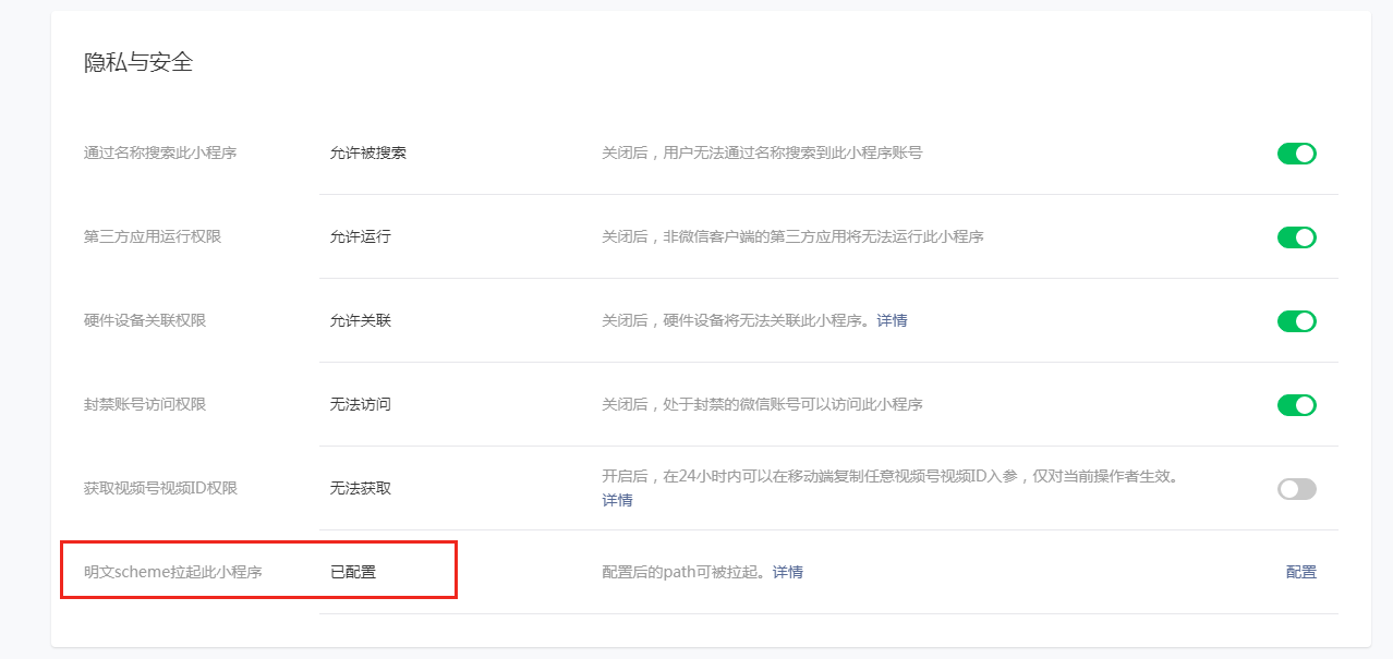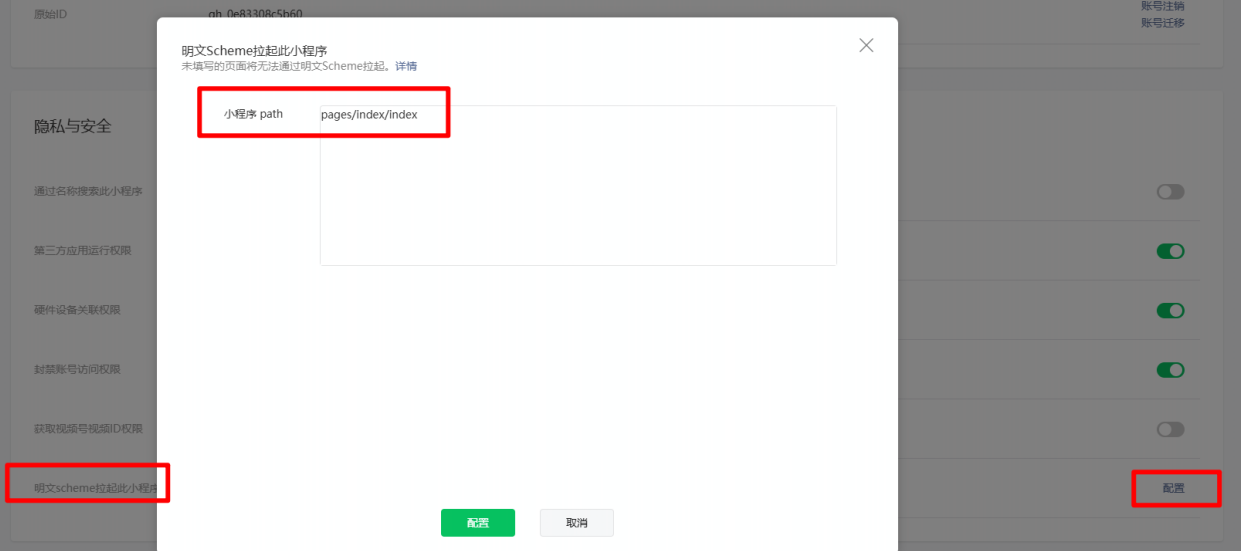 (1)点击小程序左下角图标,账号设置->隐私与安全->明文scheme拉起此小程序,配置开启明文scheme并设置好path(对应小程序在认证时展示的页面路径)