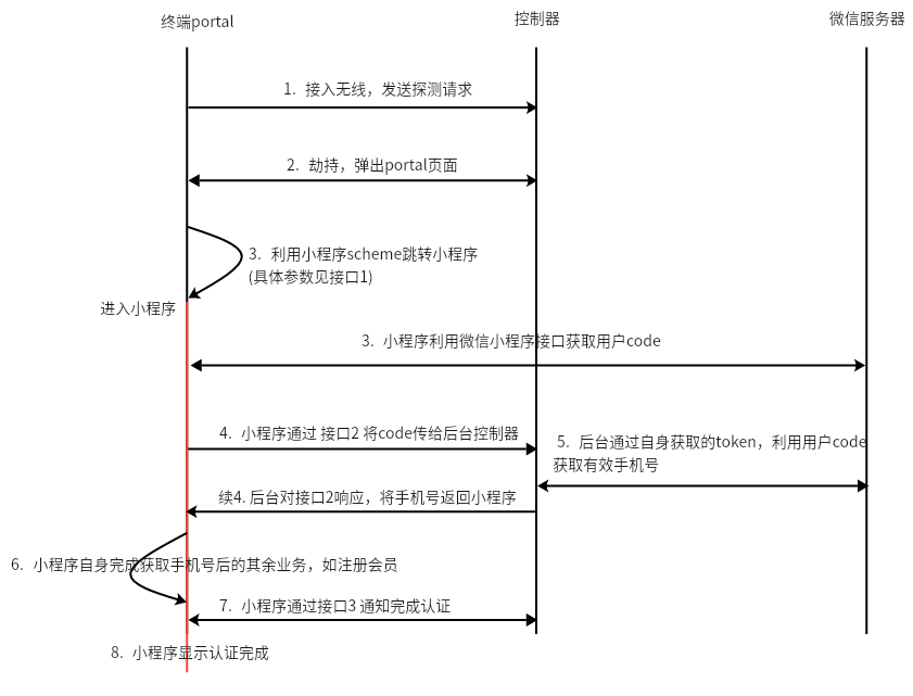 描述:Portal页面通过明文scheme链接访问小程序,在链接中拼接参数传递给小程序,参数在后续接口2与接口3中用于标识终端设备信息。