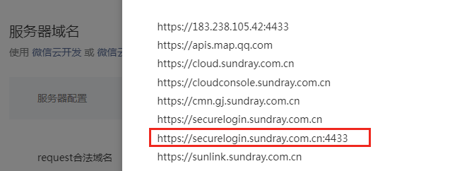 (2)服务器域名,在[开发管理]->[服务器域名],request合法域名需要添加上映射控制器IP的域名和4433端口: