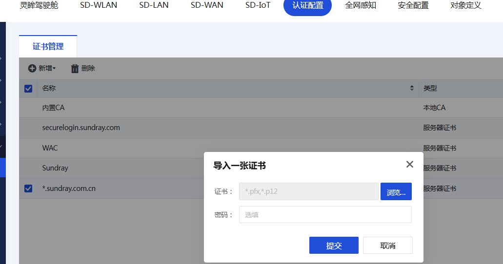 注意:如果是集中管理环境,分支设备也需要导入证书,建议使用通配符域名的证书;