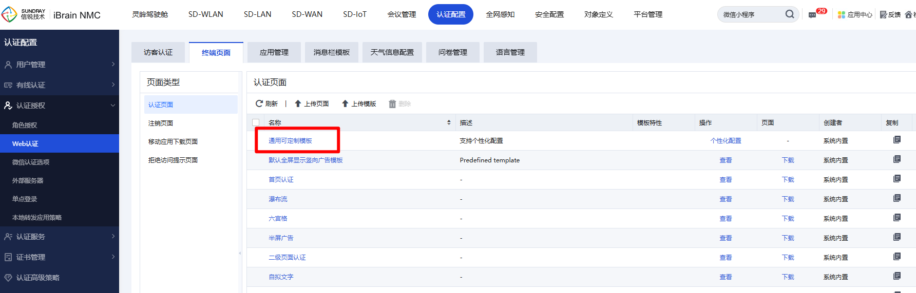 (5)无线网络portal认证,创建无线网络账号访客认证,引用包含小程序认证的访客认证方式,注意:当前小程序认证Portal认证页面仅支持通用定制模板,不支持其他模板,支持基于[通用可定制模板]进行复制。