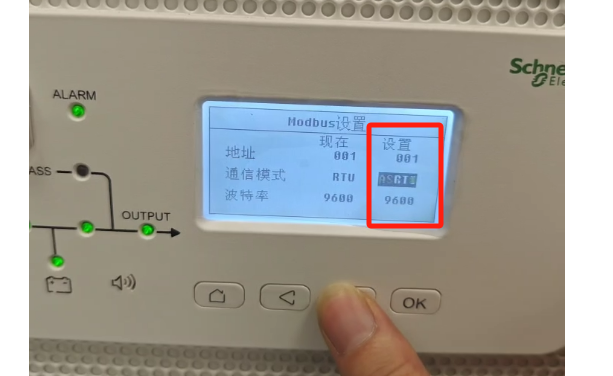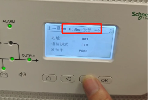 (2)继续按右键,调整到Modbus设置,检查波特率是否为9600,通信模式是否为RTU,如不是可按ok来调整为RTU