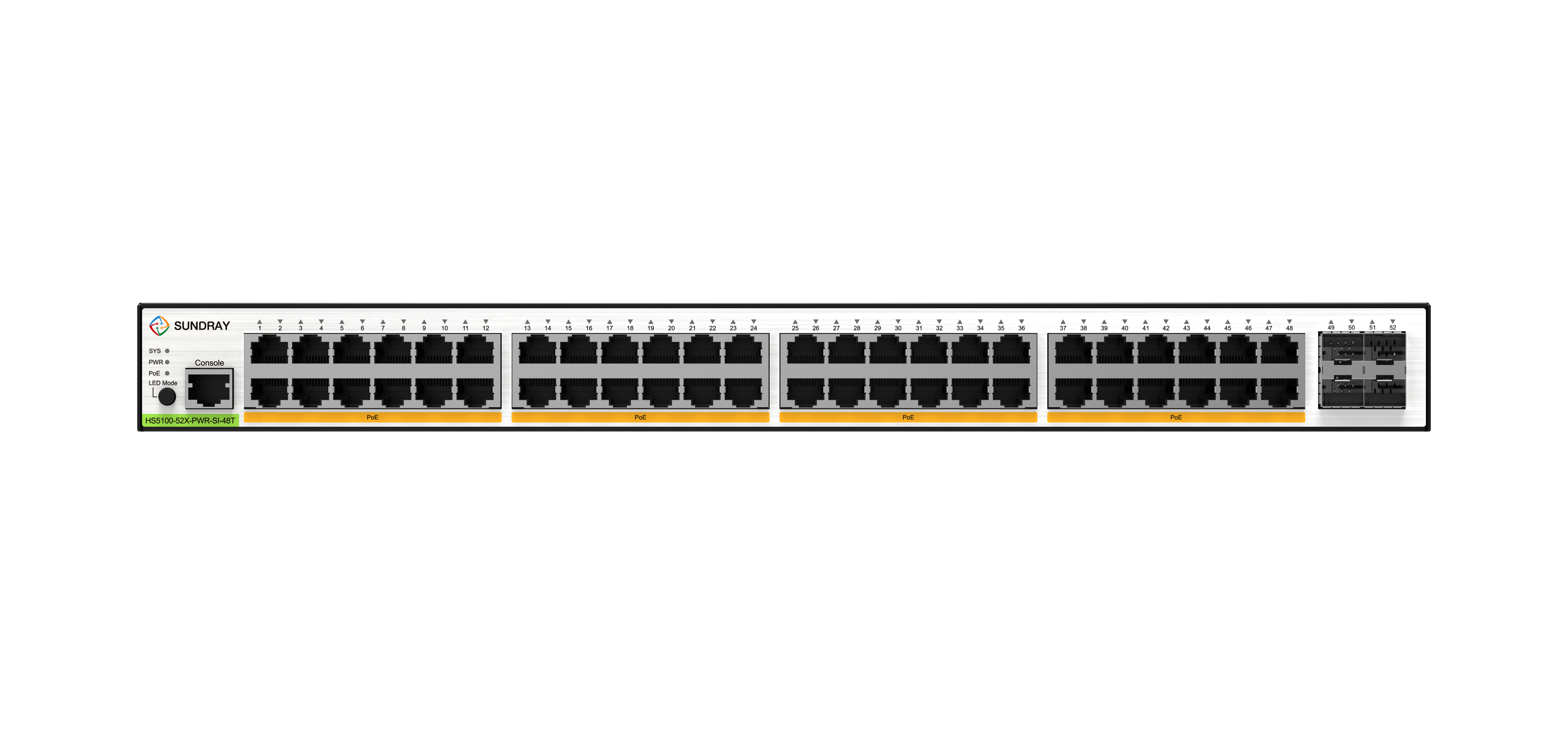 HS5100-52X-PWR-SI-48T交换机前面板提供有48个10/100/1000Mbps千兆电口、4个1G/10Gbps光口(SFP)、1个Console口以及一系列指示灯,交换机的两个侧面板为风扇和散热孔。